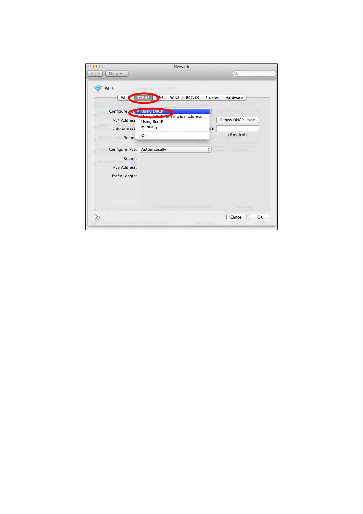 4. Select “TCP/IP” from the top menu and “Using DHCP” in the drop down