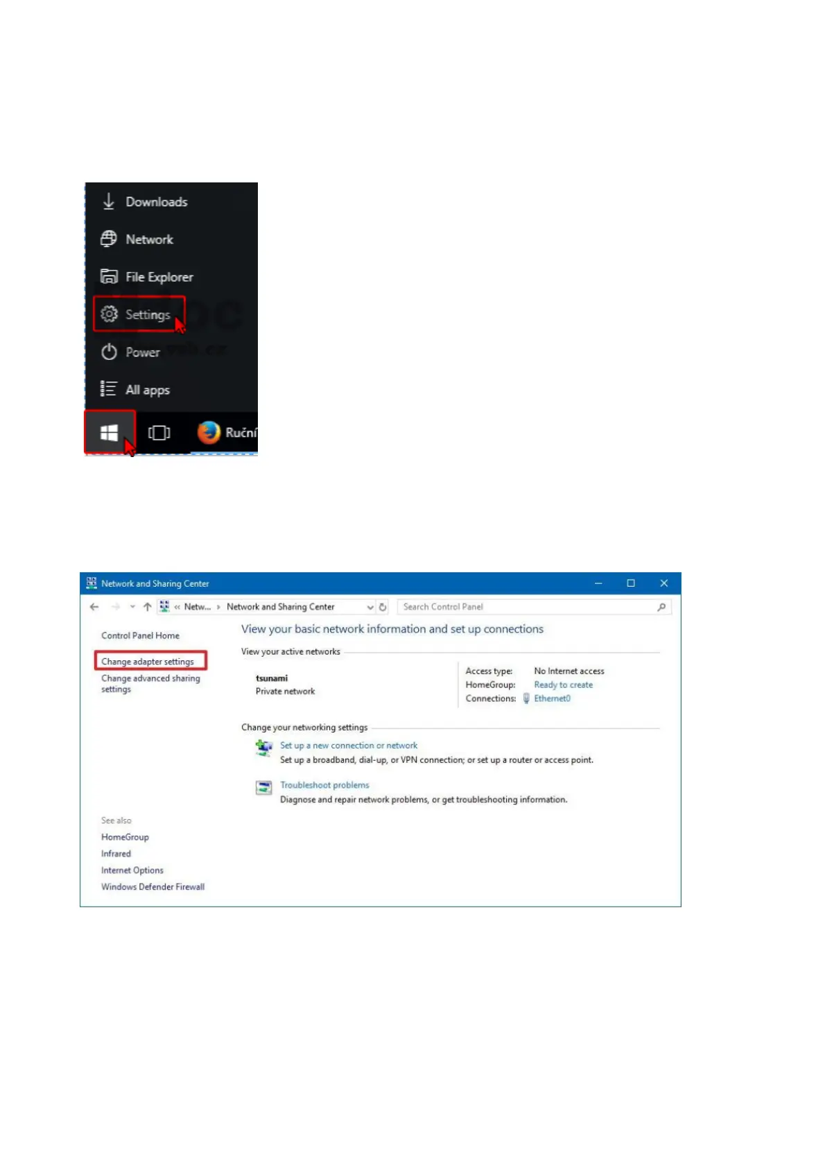 “Change adapter settings”. Choose “Ethernet”, click right mouse button