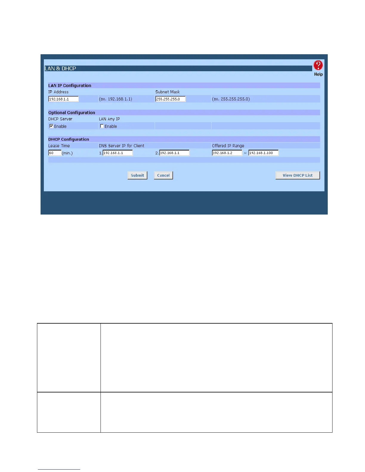 9. Select LAN & DHCP from the menu. You will see a screen like the example below.