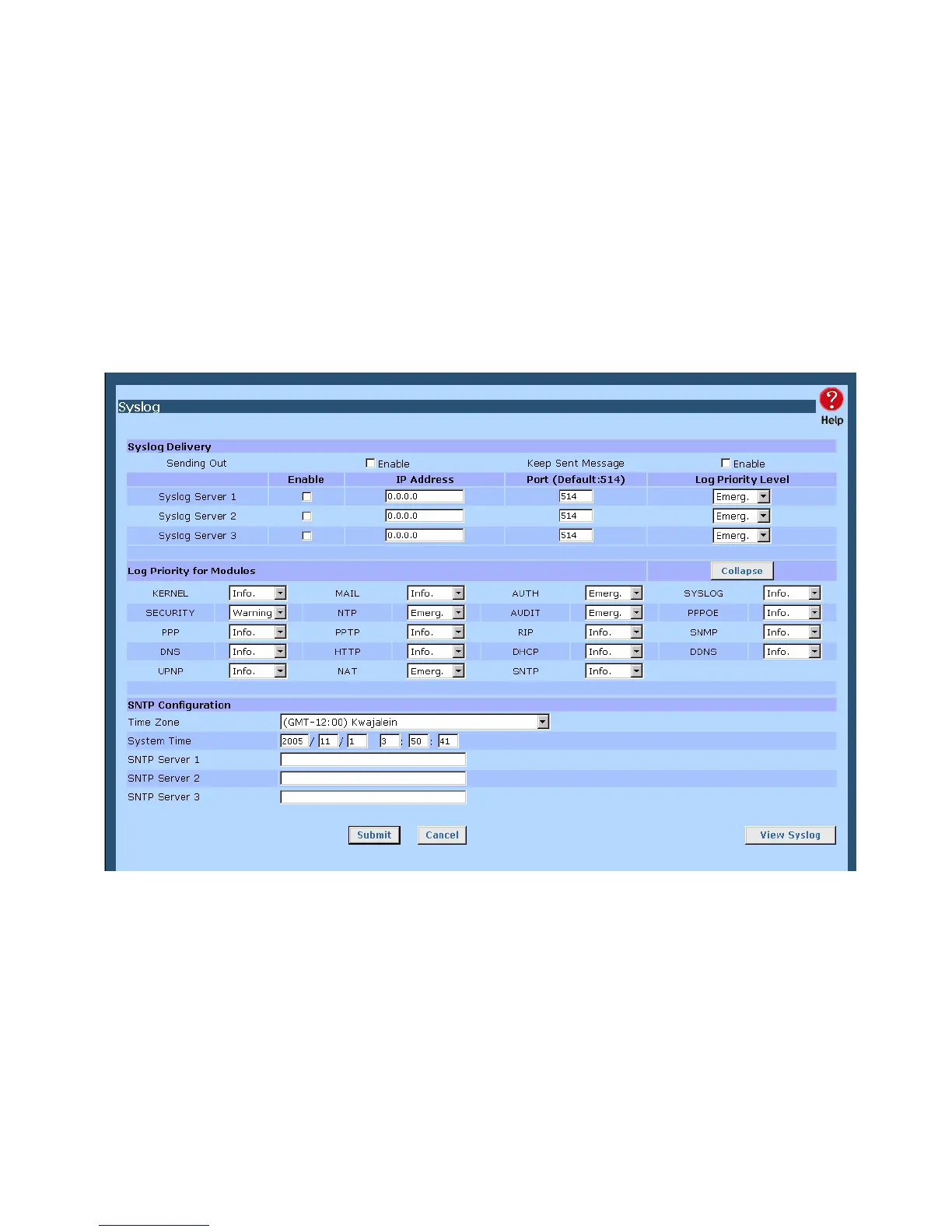 Syslog Configuration – Syslog Configuration allow you where to send system information to other