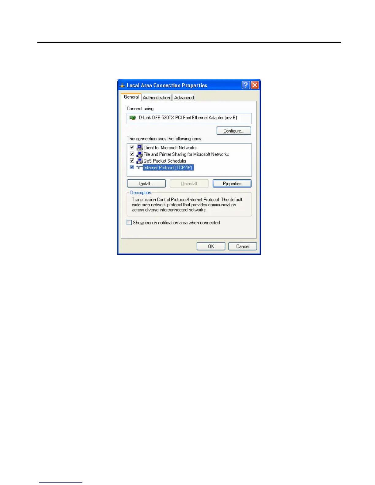 2. Right click the Local Area Connection and choose Properties. You should see a screen like the