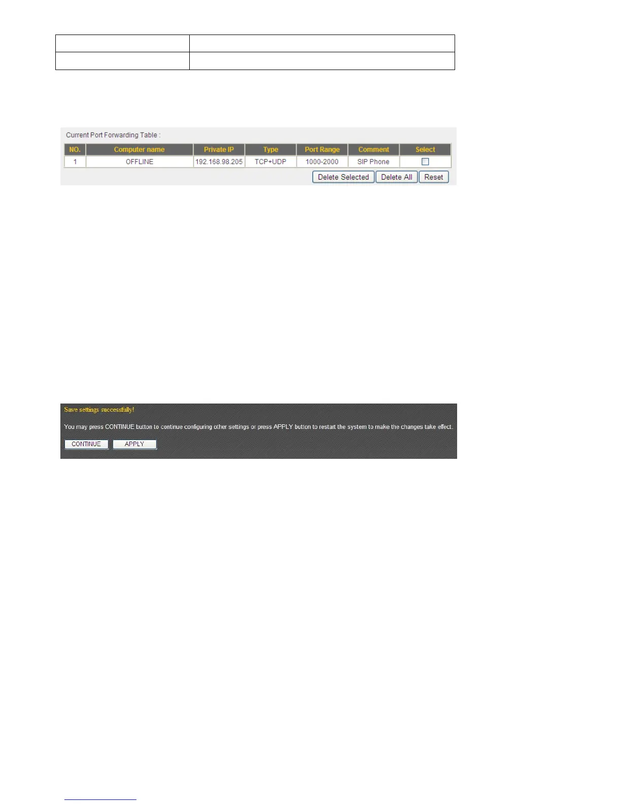 Ifyouwanttodeleteaspecificportforwardingentry,checkthe‘select’boxoftheport