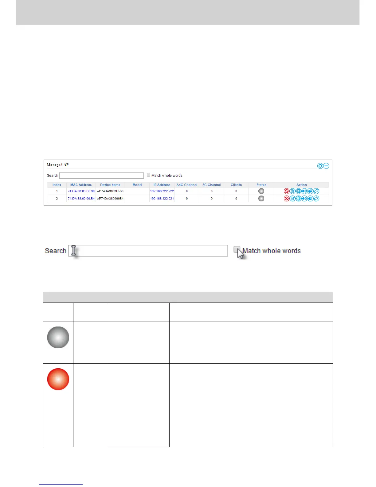 The search function can be used to locate a specific Managed AP. Type in the