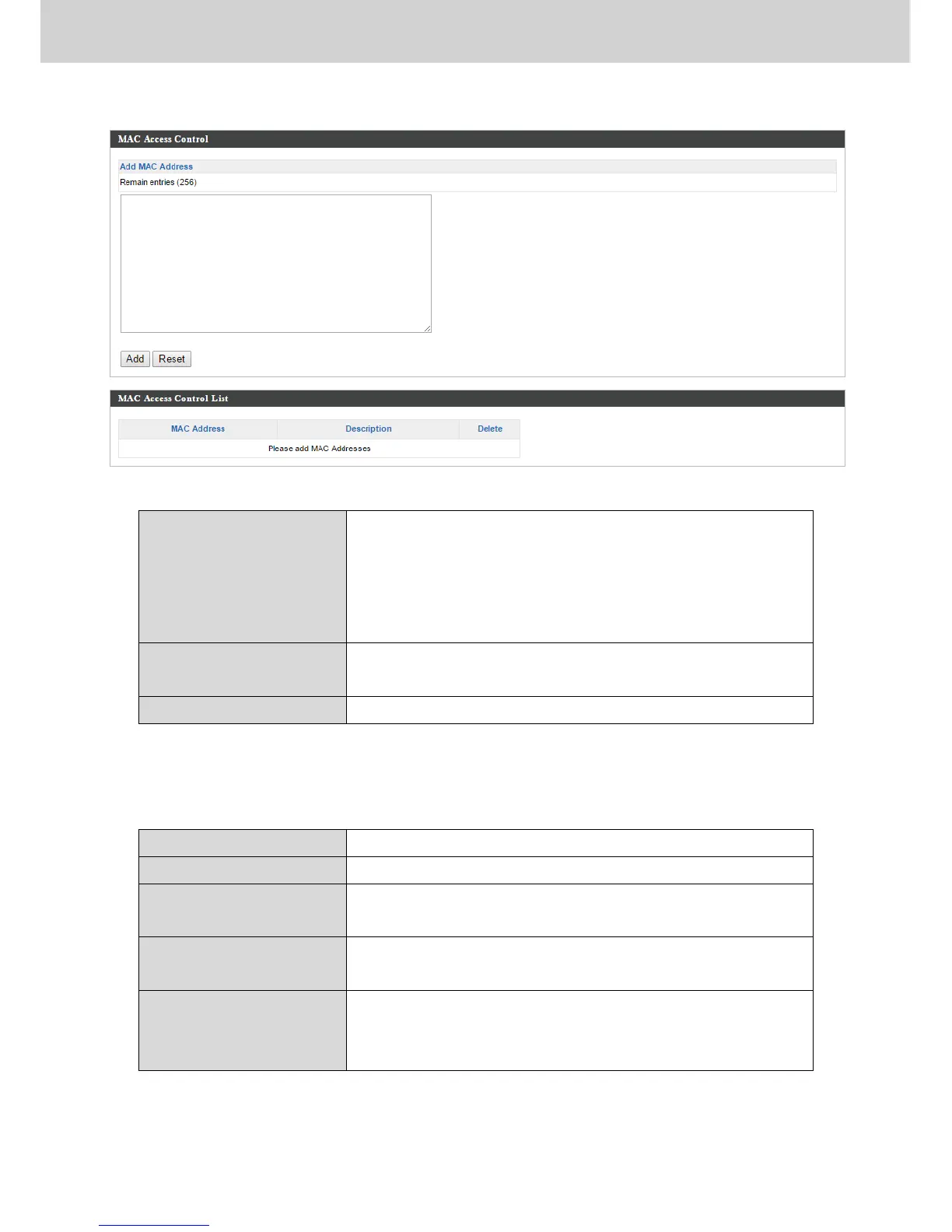 MAC address entries will be listed in the “MAC Address Filtering Table”. Select