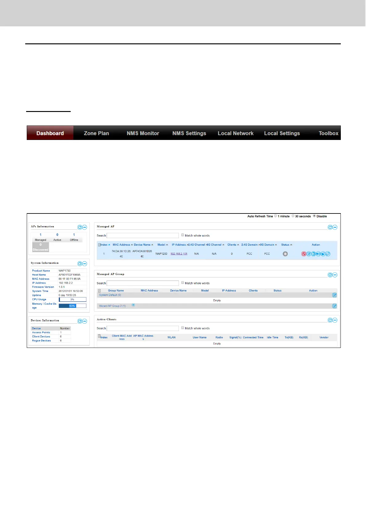 The top menu features 7 panels: Dashboard, Zone Plan, NMS Monitor, NMS
