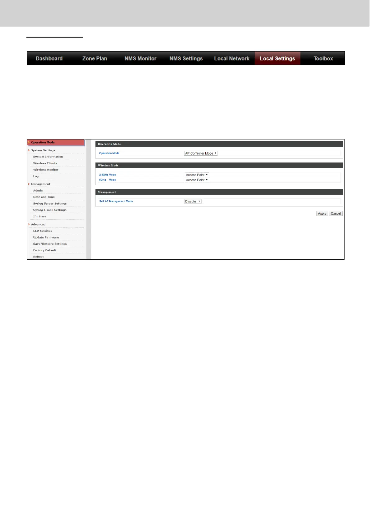 Local Settings are for your AP Controller. You can set the operation mode and