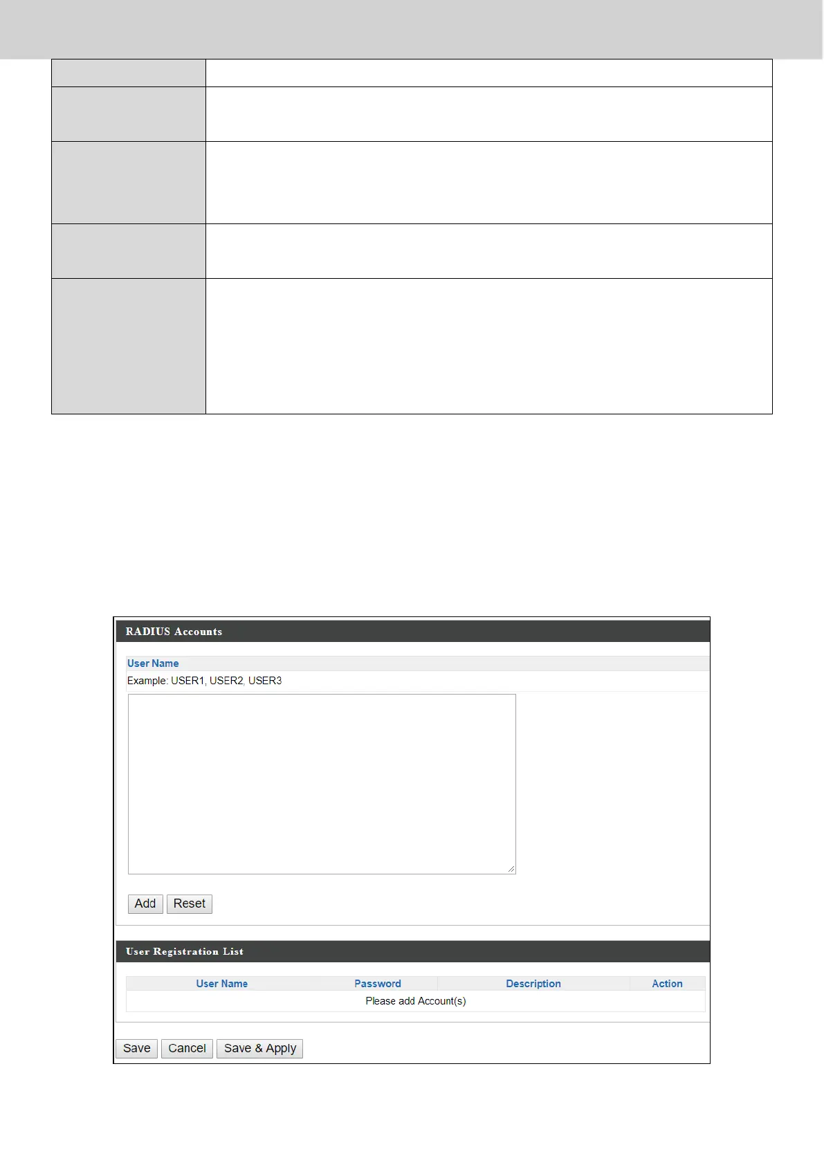 “RADIUS Accounts” page allows you to configure and manage users.