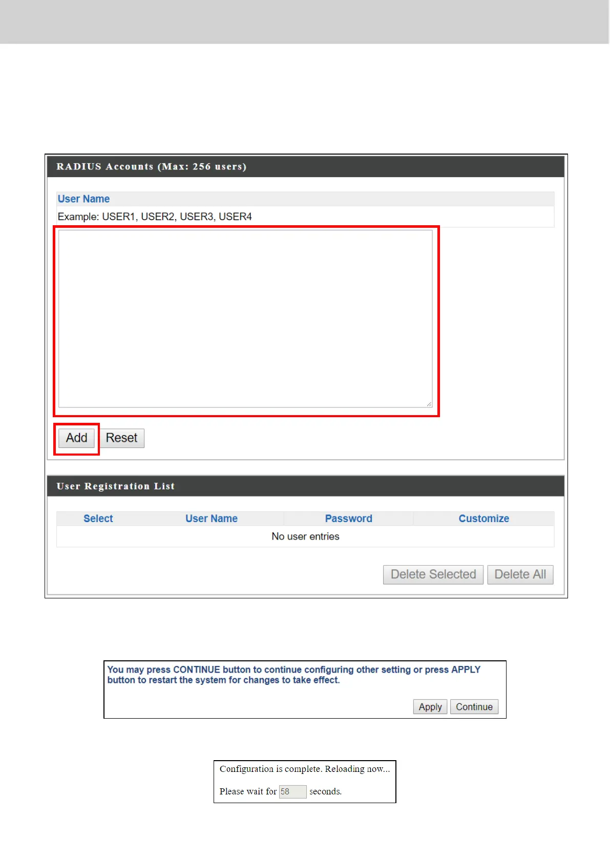 The internal RADIUS server can authenticate up to 256 user accounts. The
