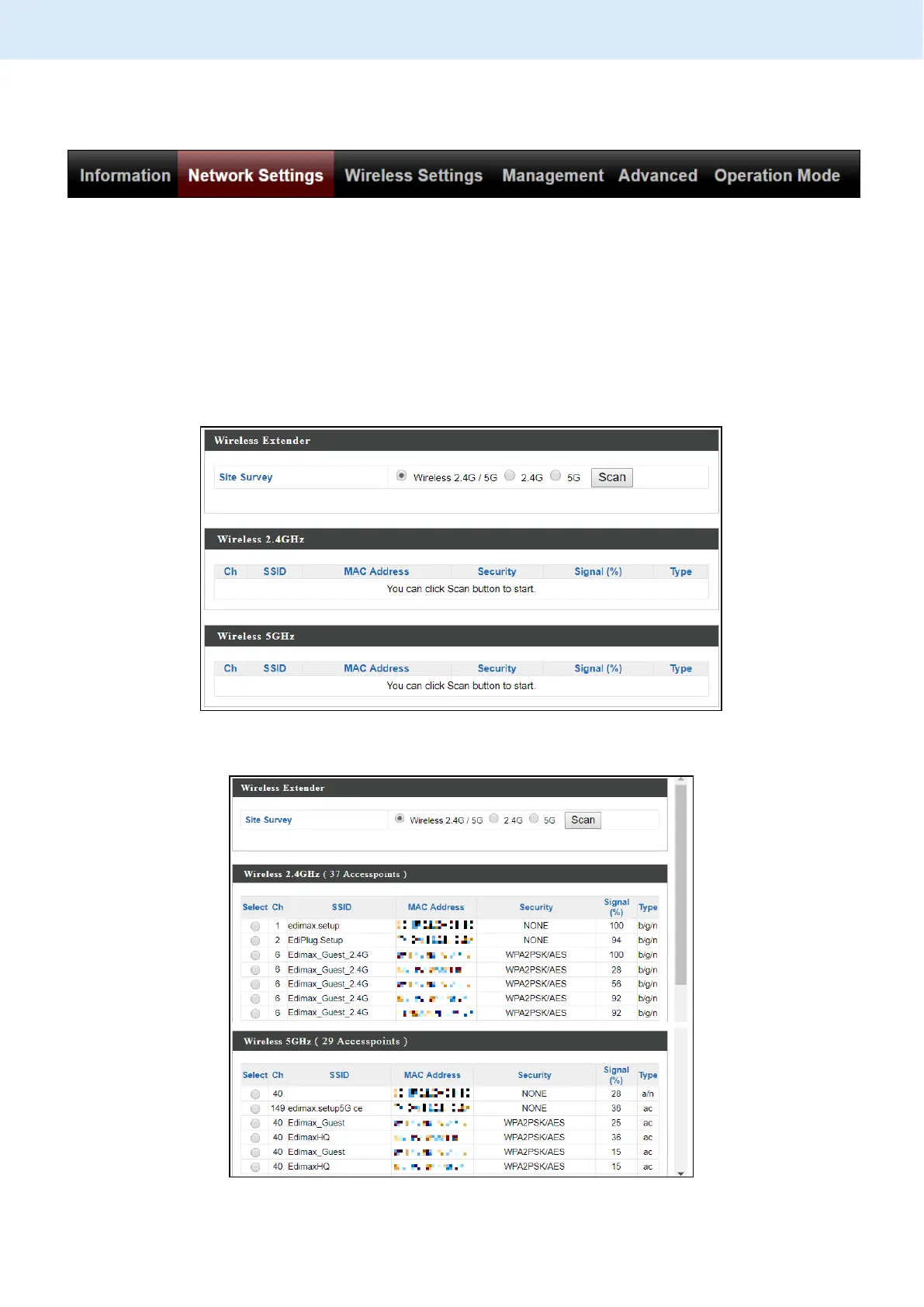 This page allows you to scan for available wireless network (both 2.4GHz and