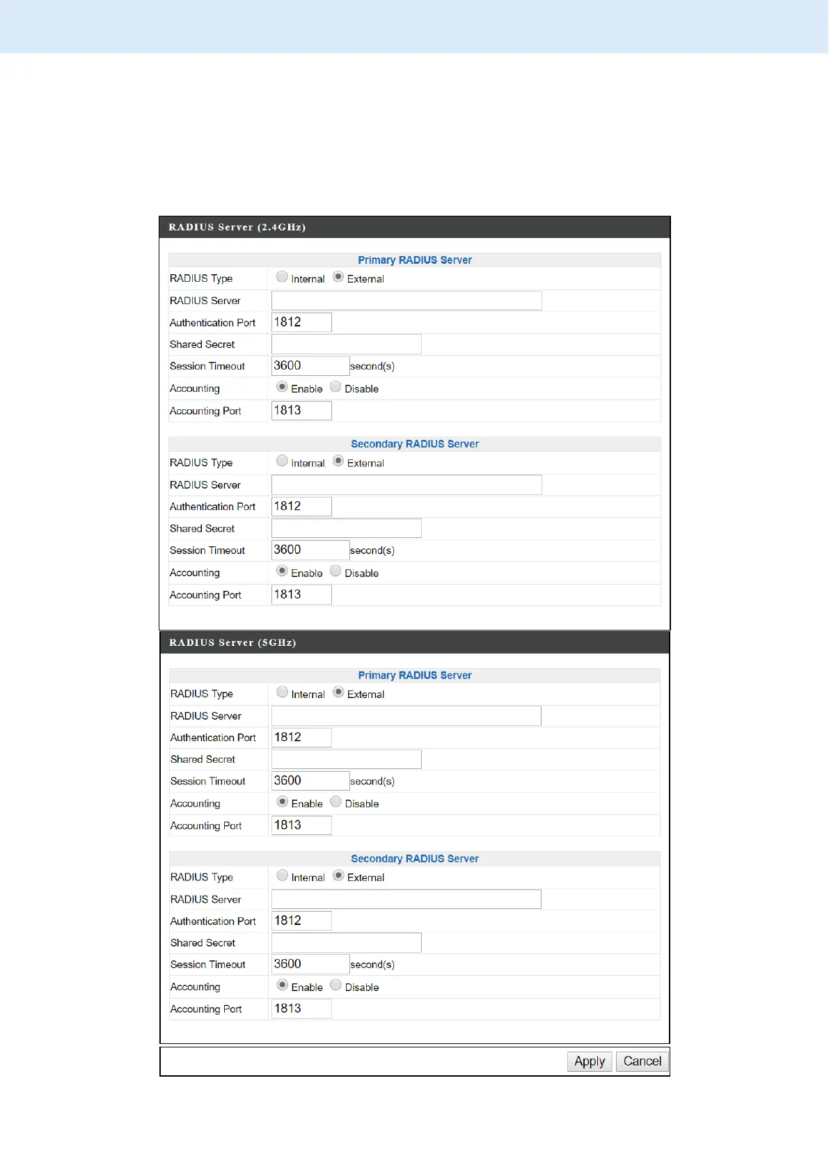 Configure the RADIUS server settings for 2.4GHz and 5GHz. Each frequency