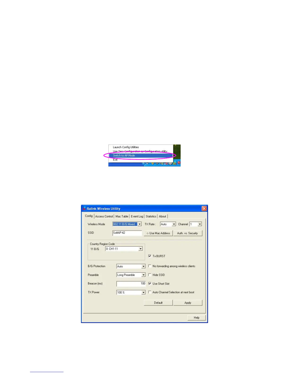 Right click the Ralink Configuration Utility icon on the system tray of Windows and select “Switch to AP