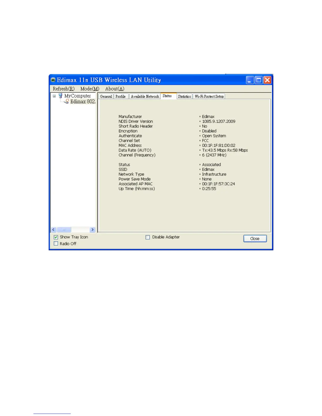This screen shows the information of manufacturer, driver version, settings of the wireless network the