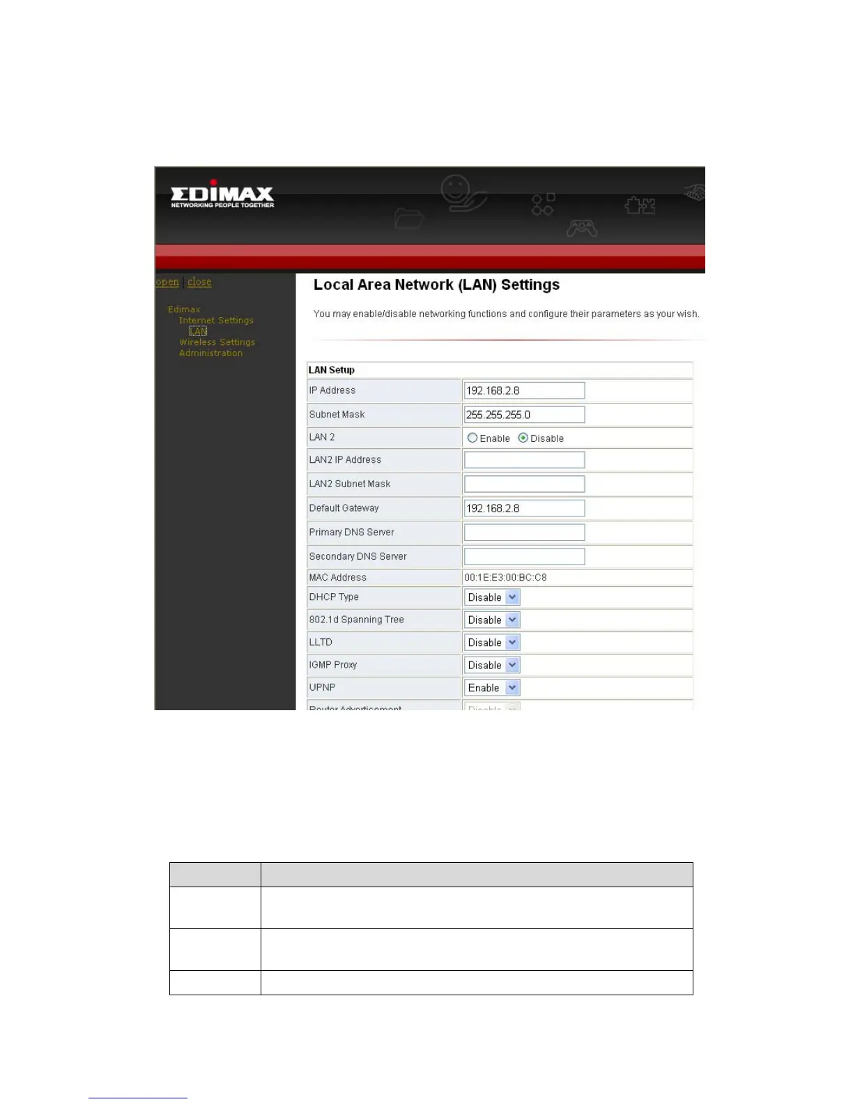 LAN 2 Enable or disable the second IP address of the LAN