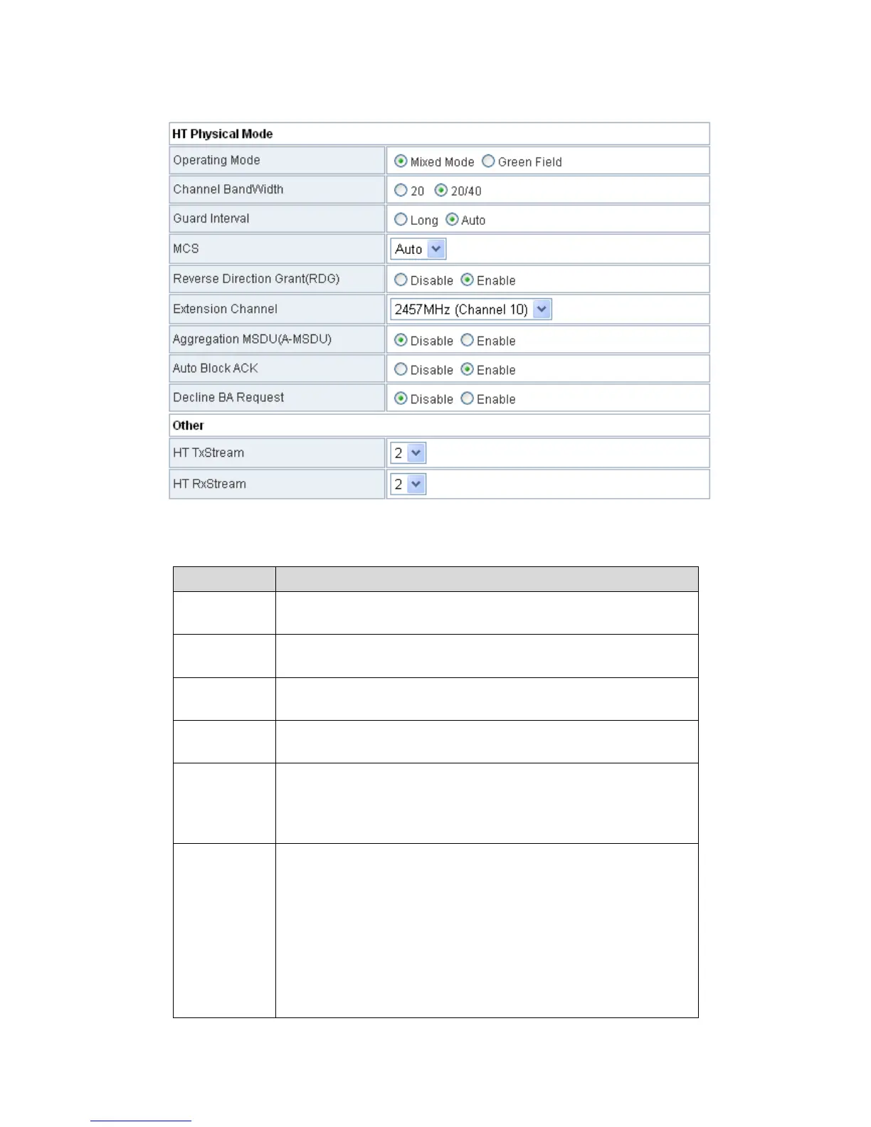 The parameters of HT Physical Mode are described as follows: