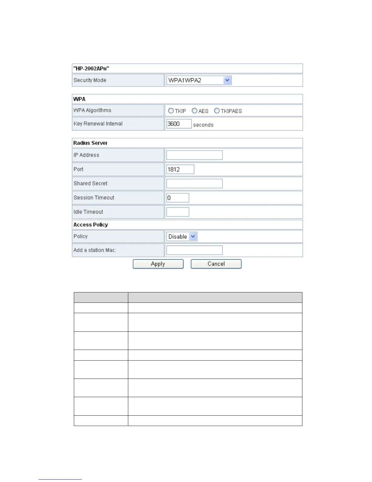 The parameters of WPA1WPA2 are described as follows: