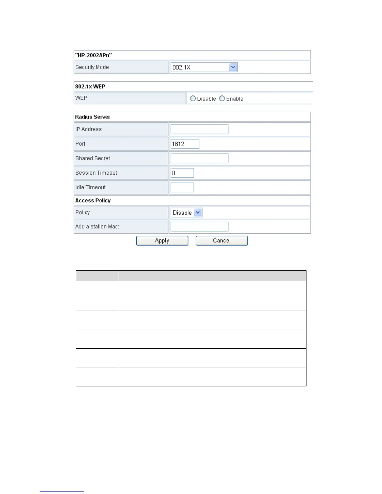 The parameters of 802.1X mode are described as follows: