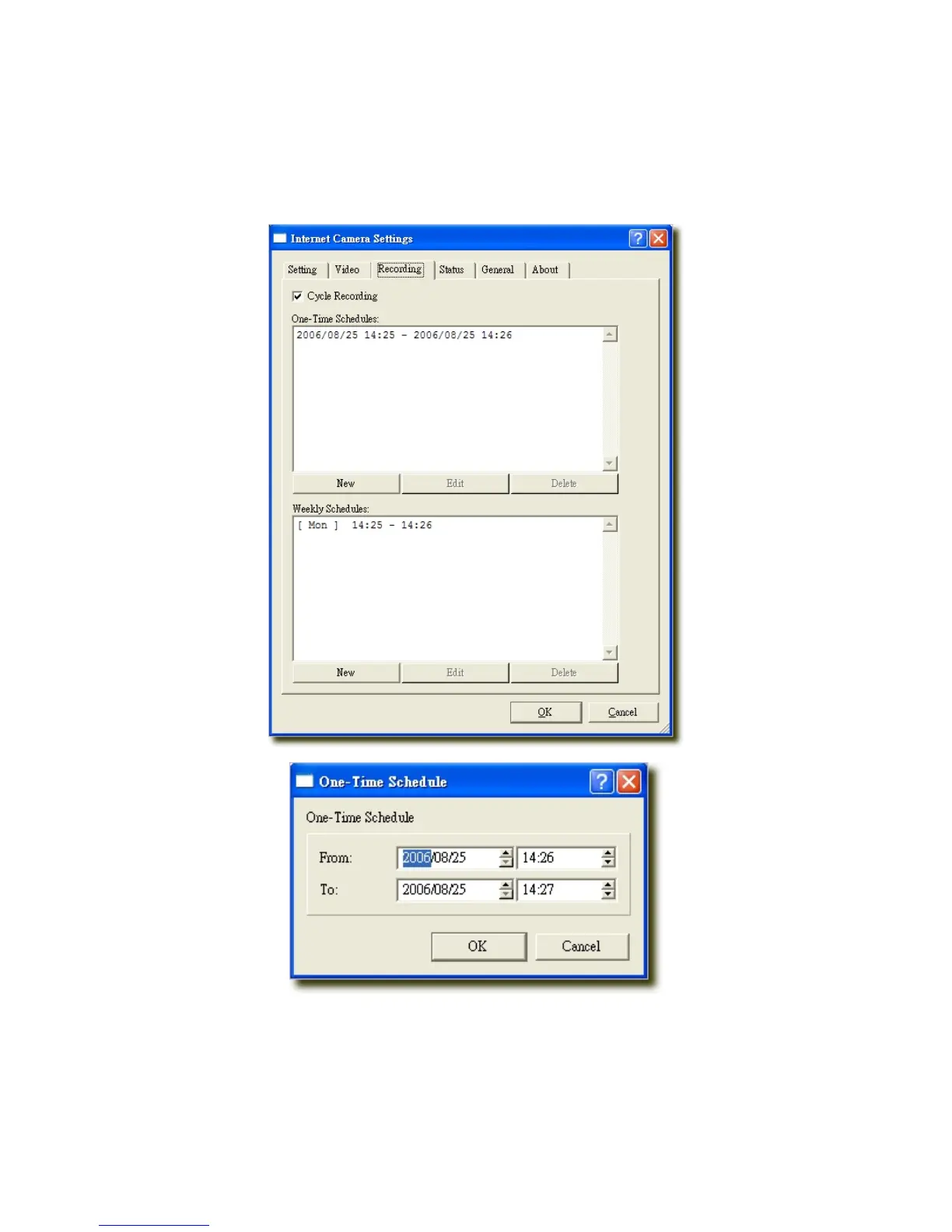 2. The schedule setting of one-time or weekly schedule should not overlap, or the recording will fail.