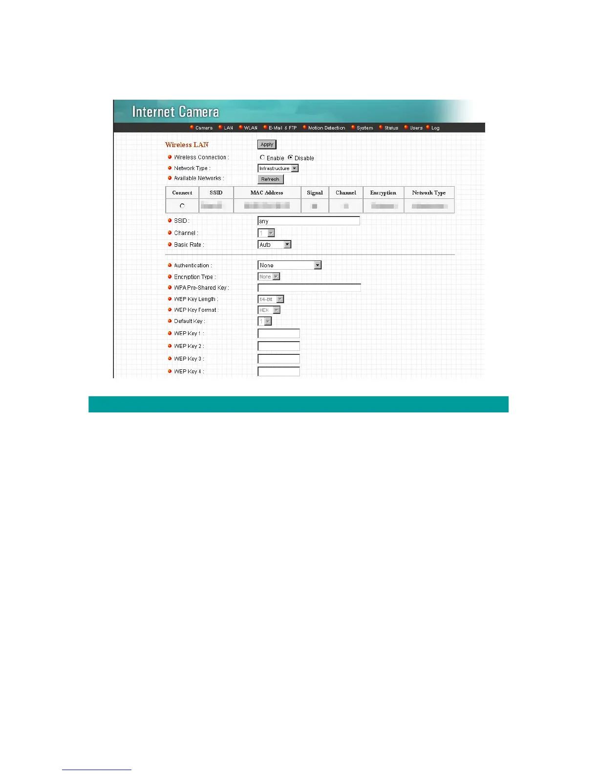 Wireless connection Enable or disable the wireless function of the Internet Camera. By