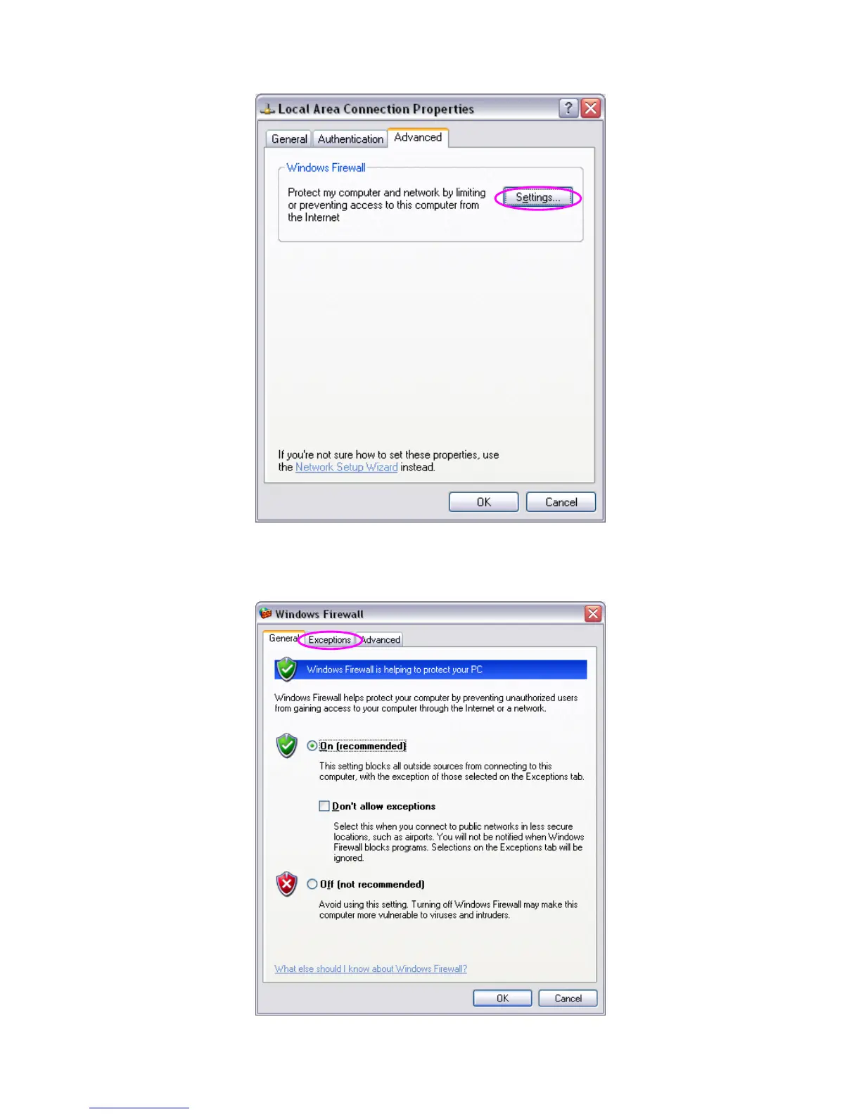 4. The “Windows Firewall” screen will be popped up, select “Exceptions” option menu.