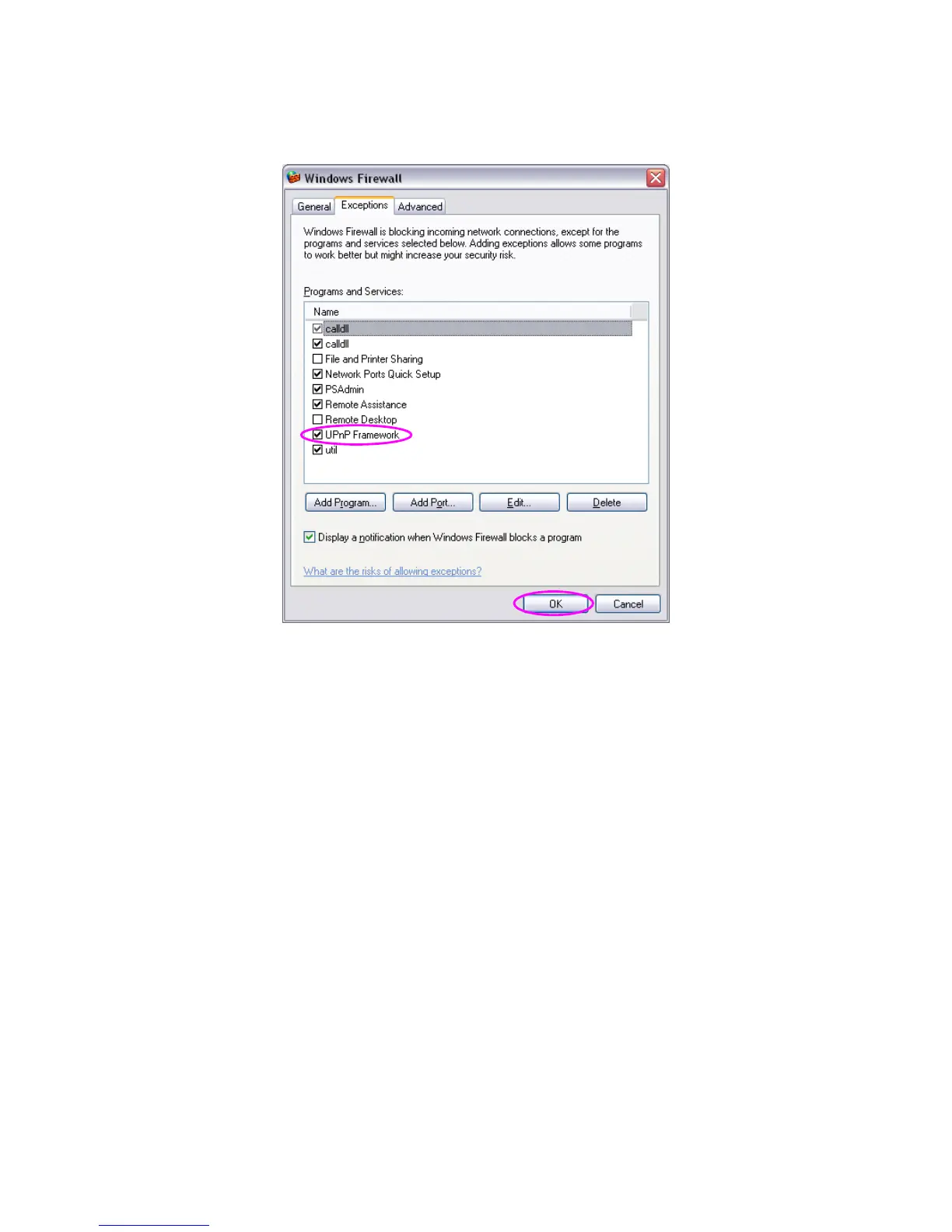 5. Enable “UPnP Framework” from the “Programs and Services list” and click “Ok”.