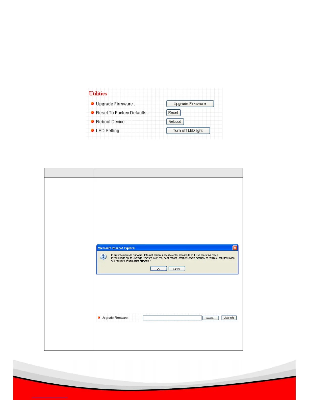 This menu allows you to upgrade firmware, clear all settings, reboot the IP camera,