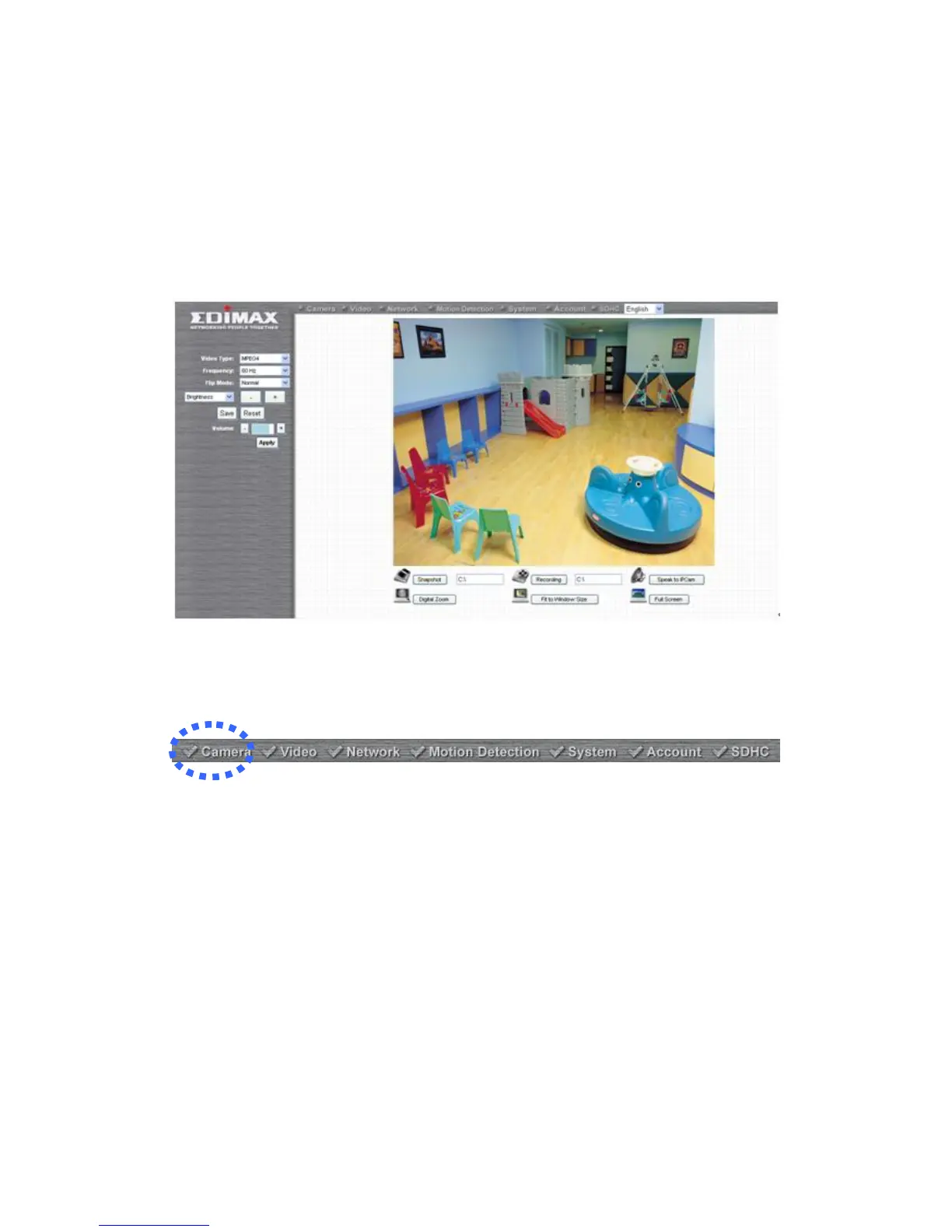 The first menu after you logged onto web management interface is Camera,