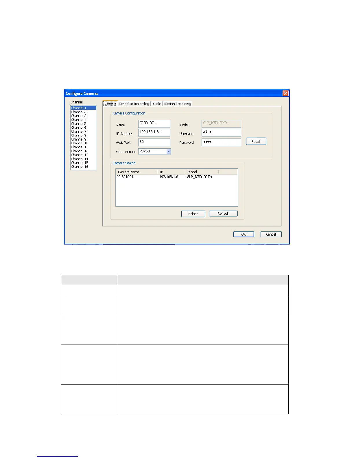 In this tab you can configure all cameras you wish to connect. Up to 16