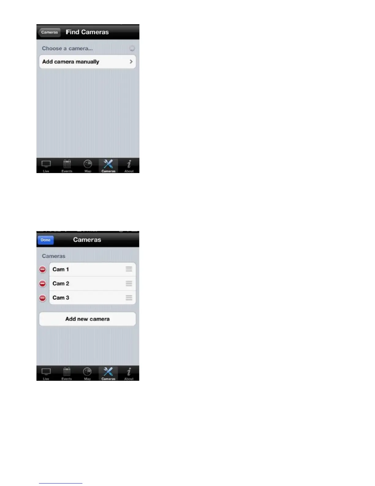 an empty list is shown. Tap Add New Camera to manually add a network camera