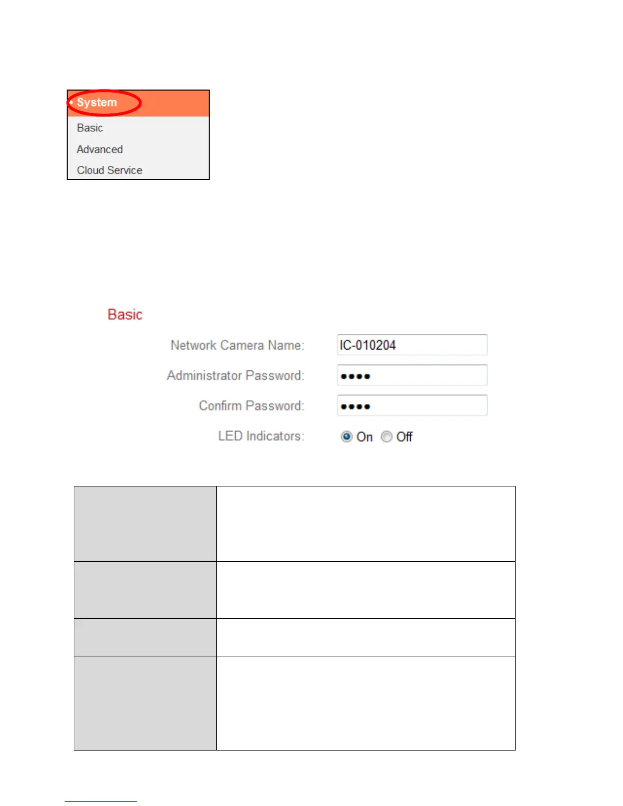 The “Basic” menu enables you to set the camera’s name and administrator