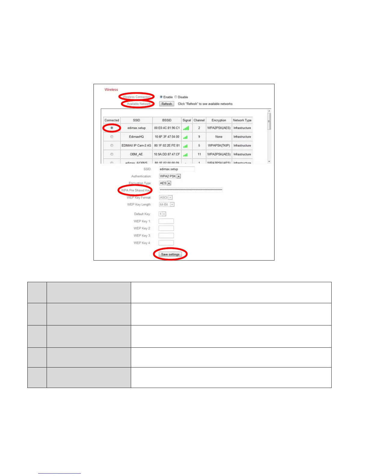 1. Configure the wireless settings A E shown in the table below: