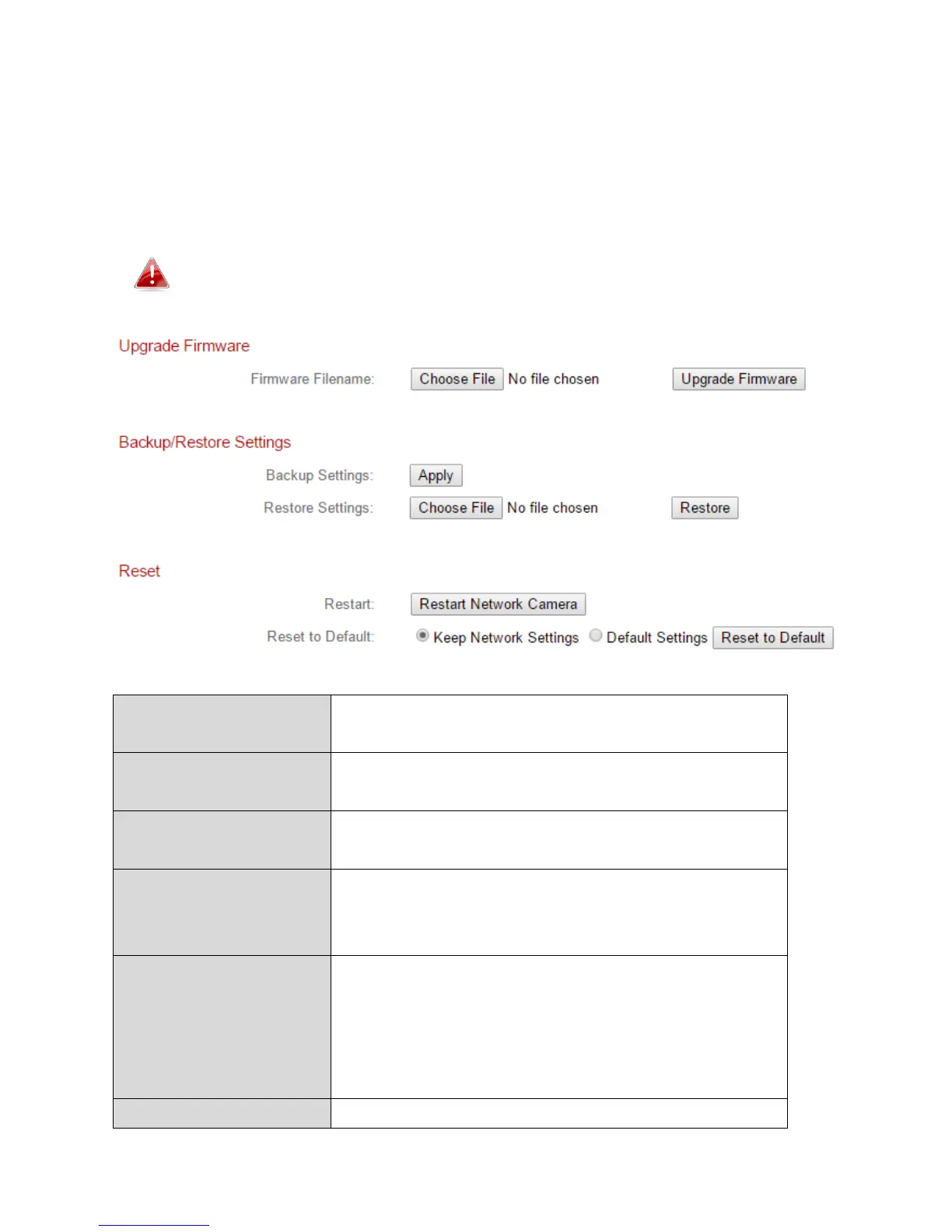 The “Advanced” page allows you to upgrade the network camera’s firmware,