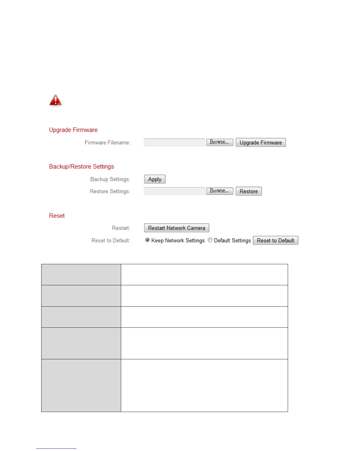 The “Advanced” page allows you to upgrade the network camera’s firmware,