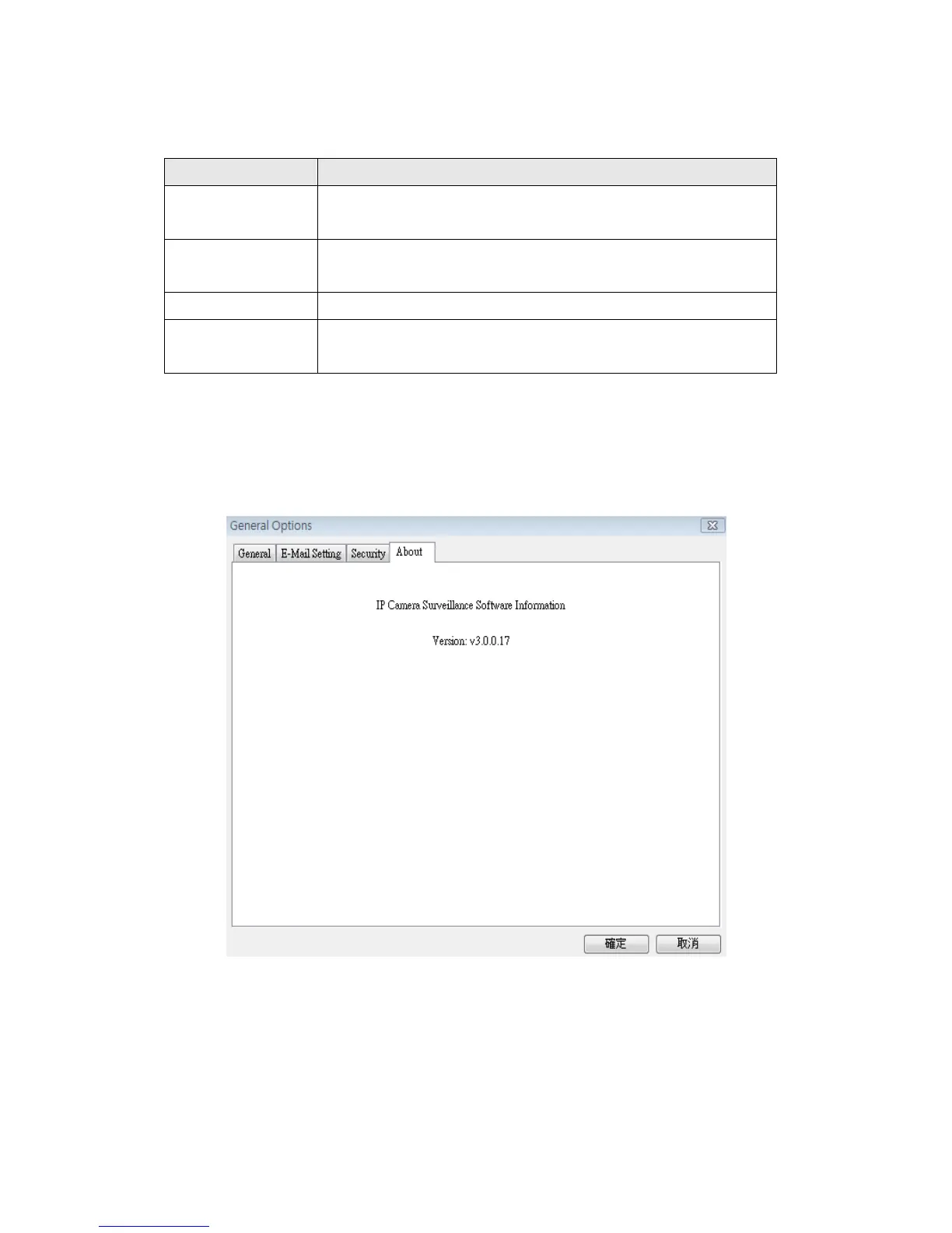 This tab shows the version number of the IP camera surveillance software