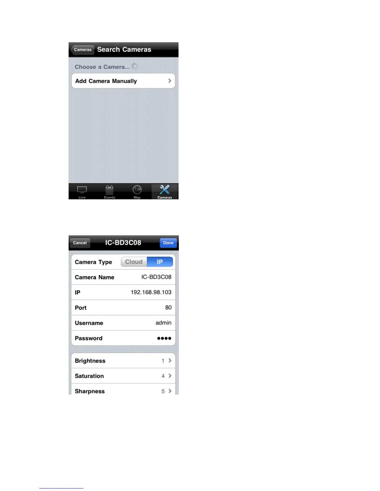 Camera Type: Switch operating mode between Cloud and IP. In cloud