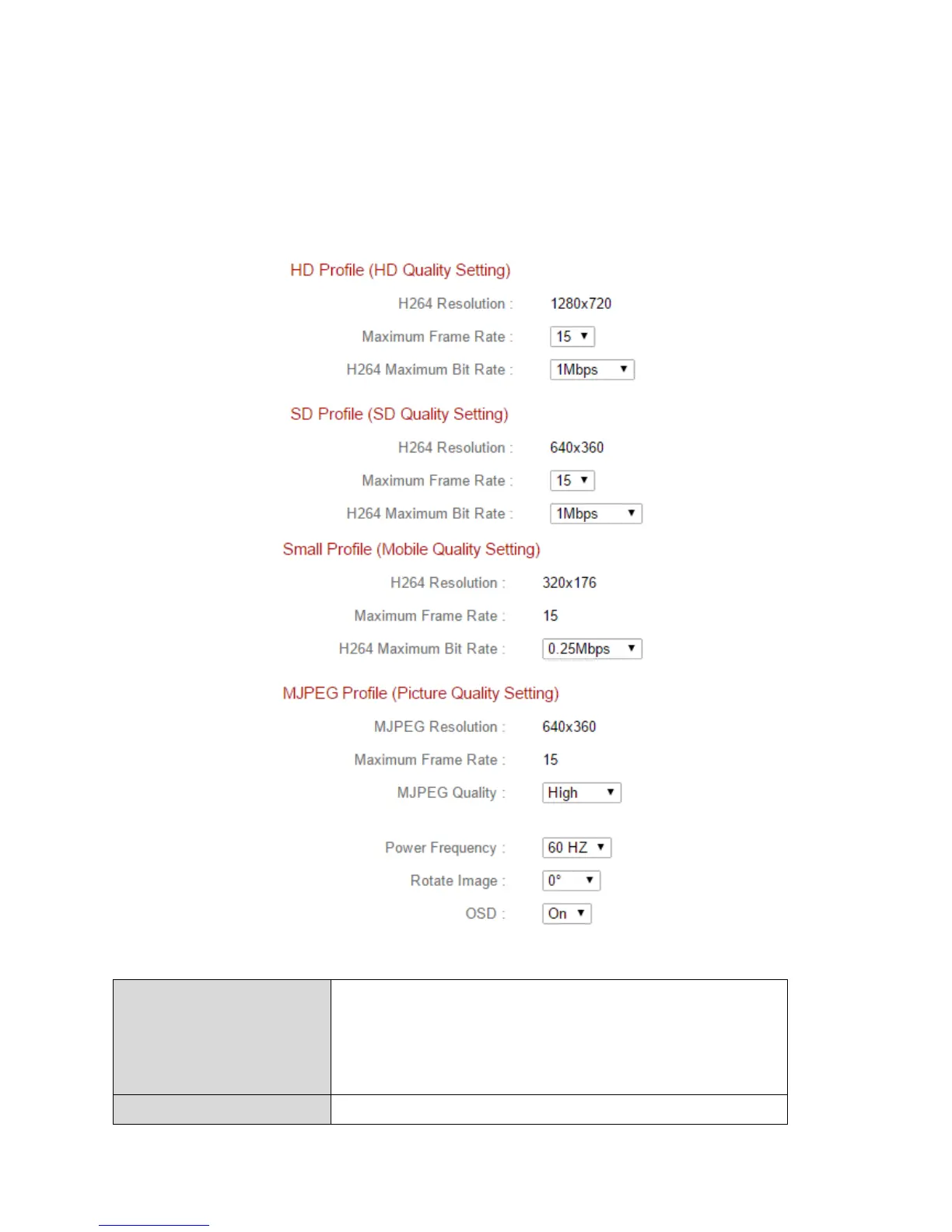 resolution and frame rate settings for different profiles: HD, SD, Small (mobile)