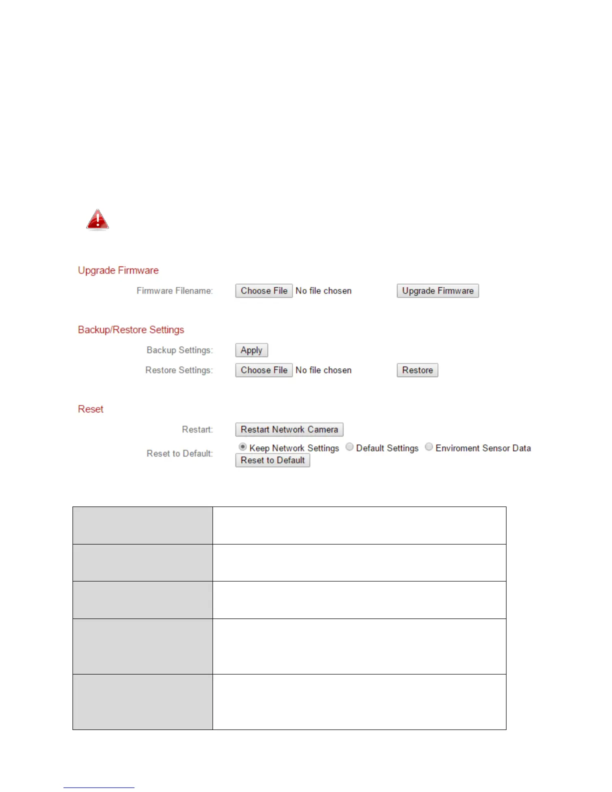 The “Advanced” page allows you to upgrade the network camera’s firmware,
