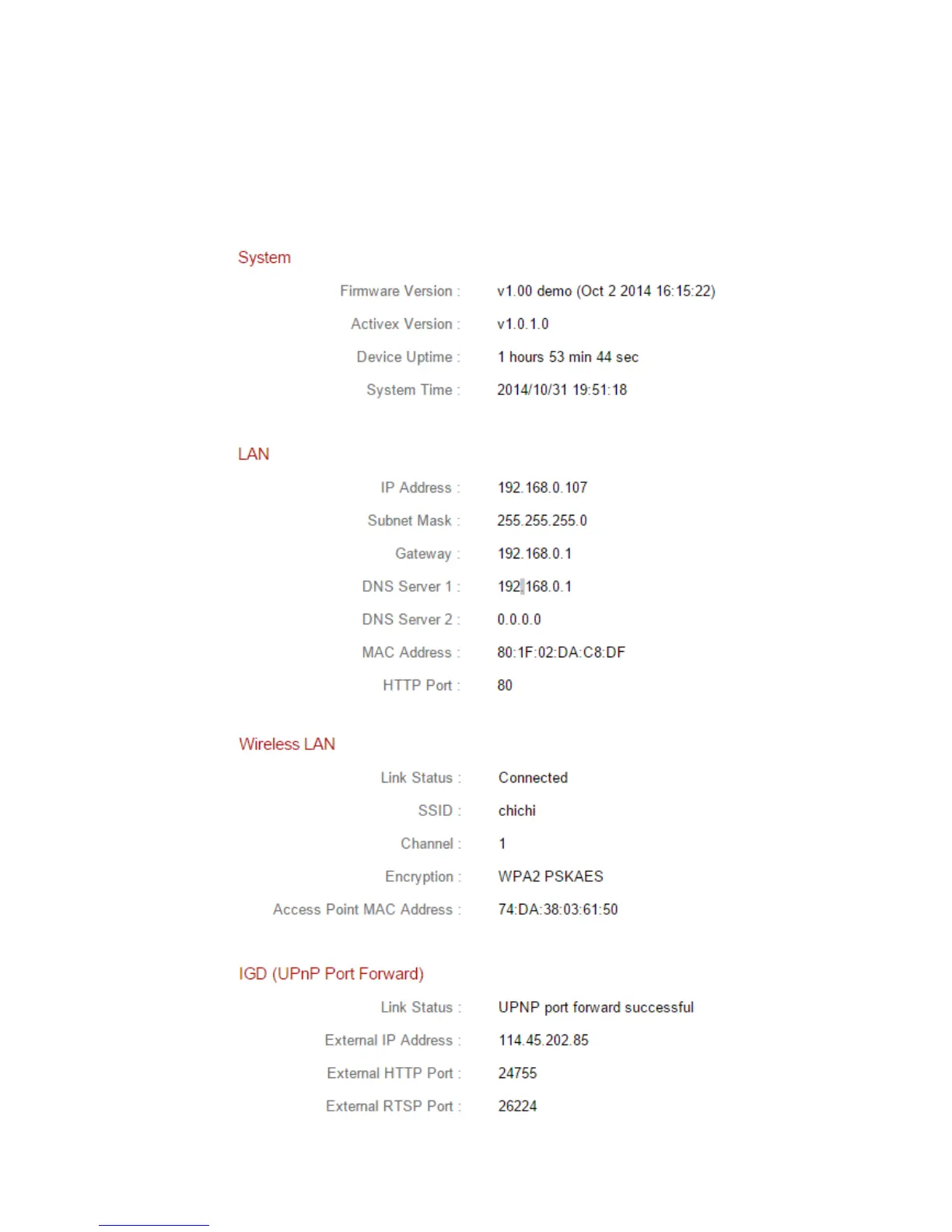 displayed on this page, displayed under four categories: System, LAN, Wireless
