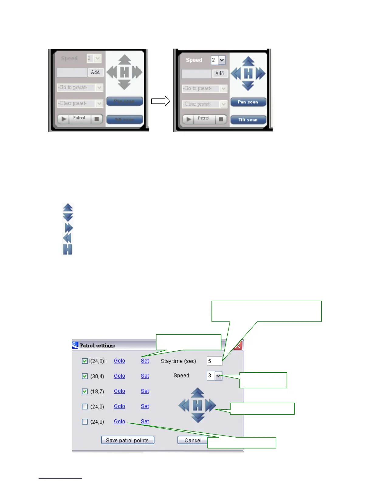 patrol, User can use the direction arrow in blue to set each point the user want to stop in a