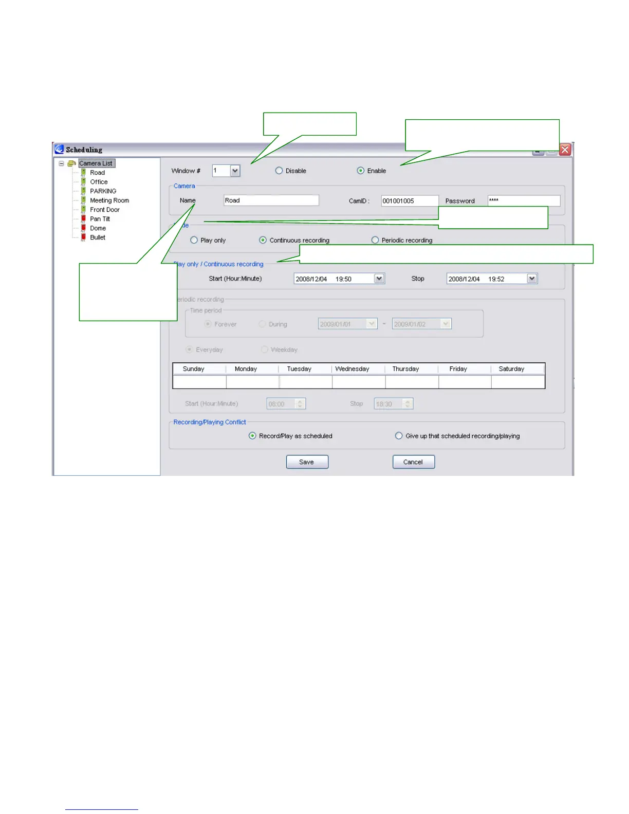 The start/end time (for play only/continuous recording mode)