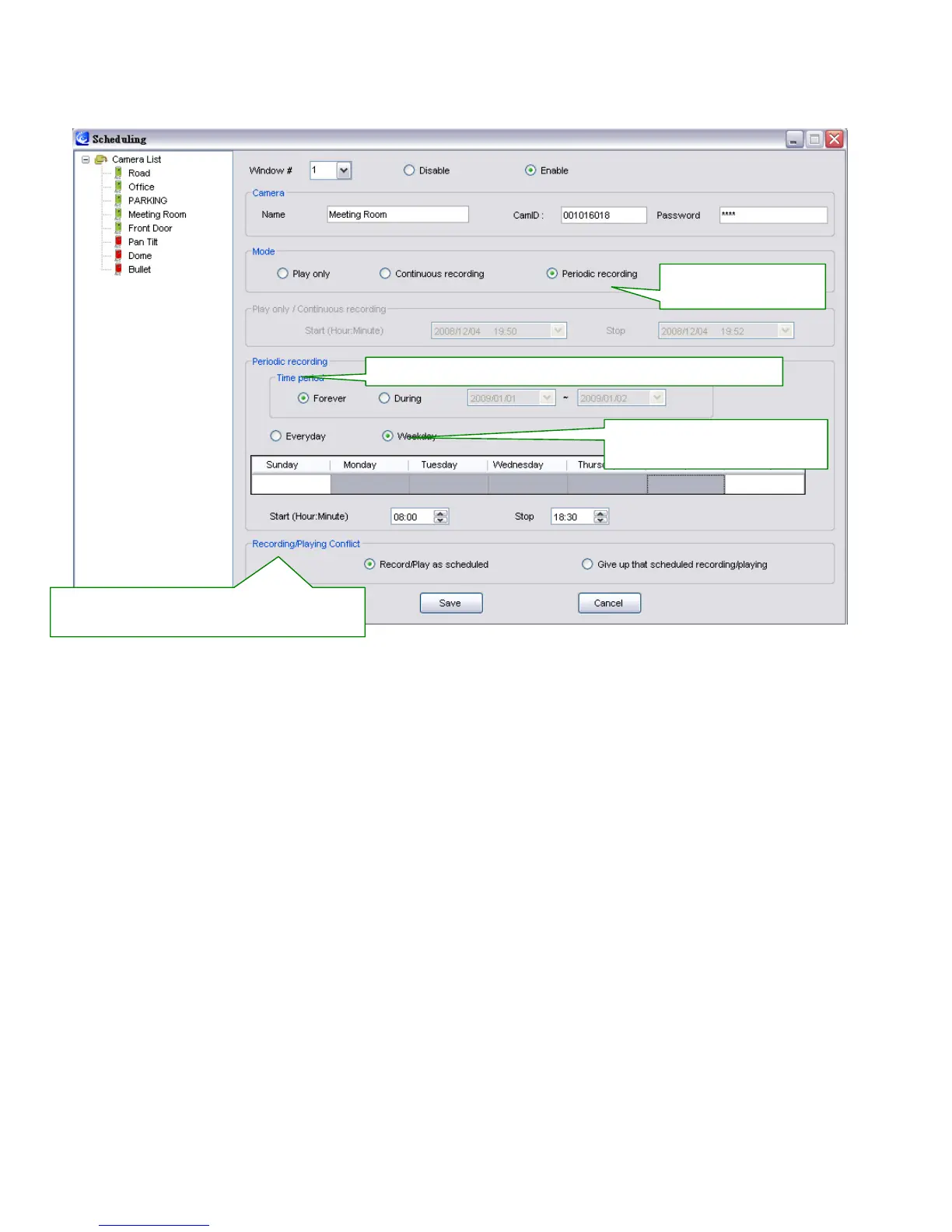window. Choosing “Record as scheduled”, CamView connects to the scheduled camera.