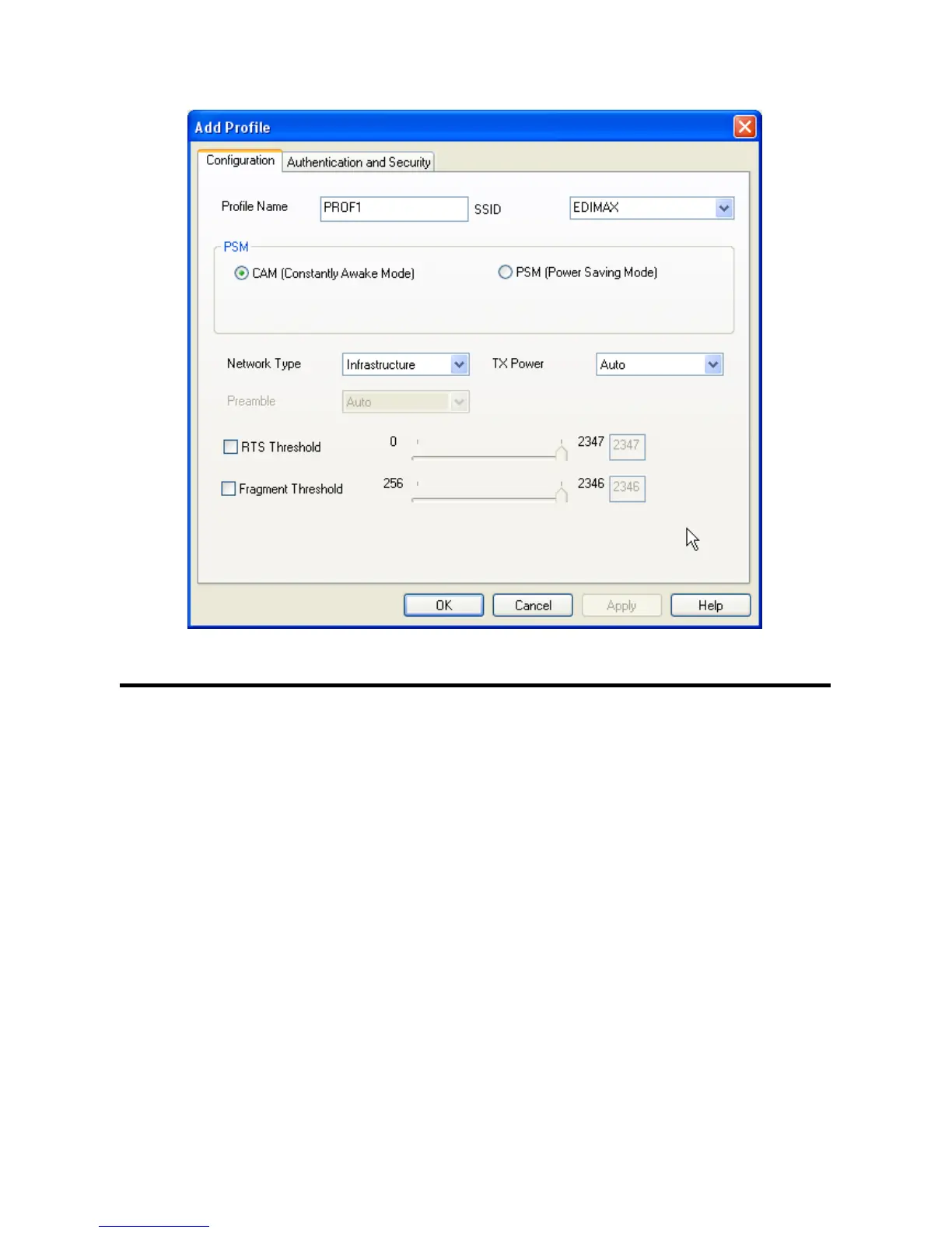Network Type Select network type (‘Ad Hoc’ or ‘Infrastructure’). If you’re adding a profile from an