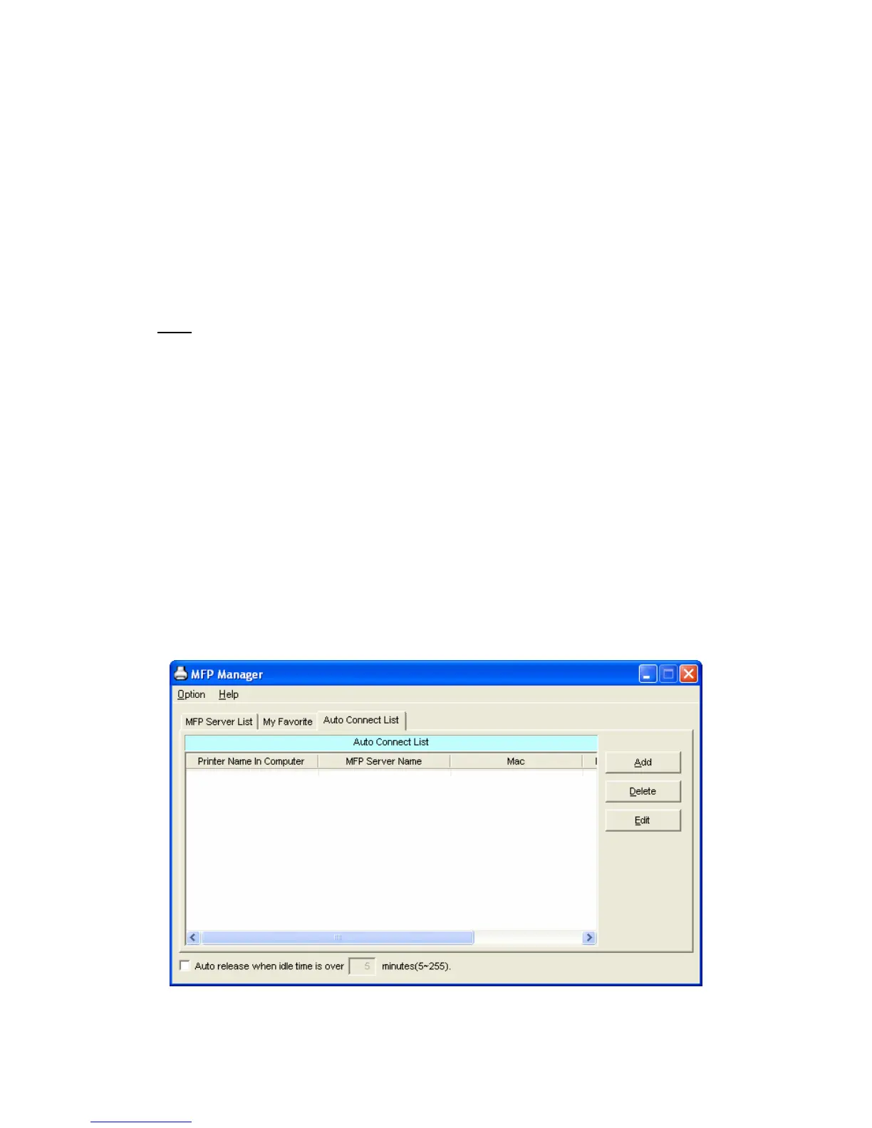 print server, you can add the MFP into your Auto Connect List. The