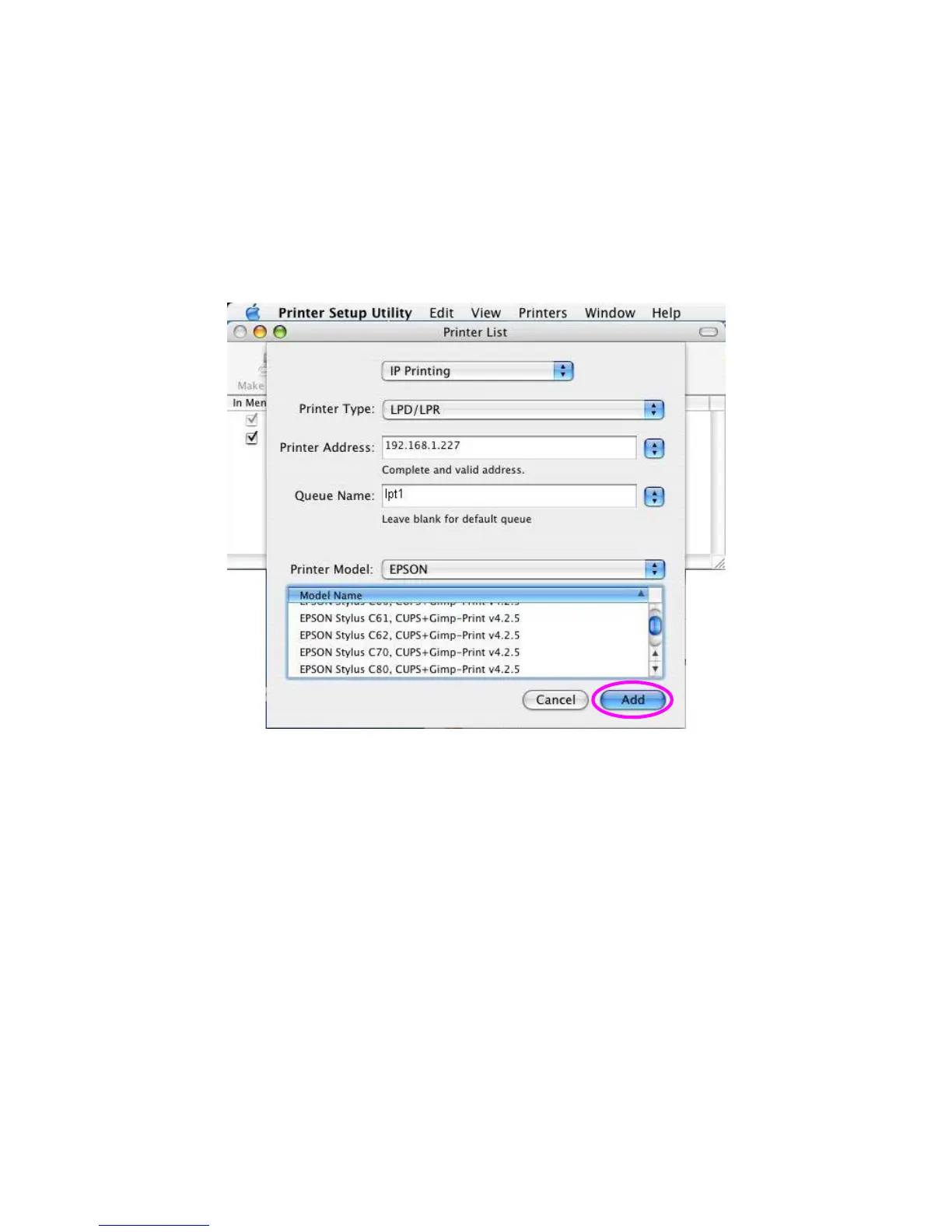 the “Printer Model” to setup the server. Click “Add” to continue.