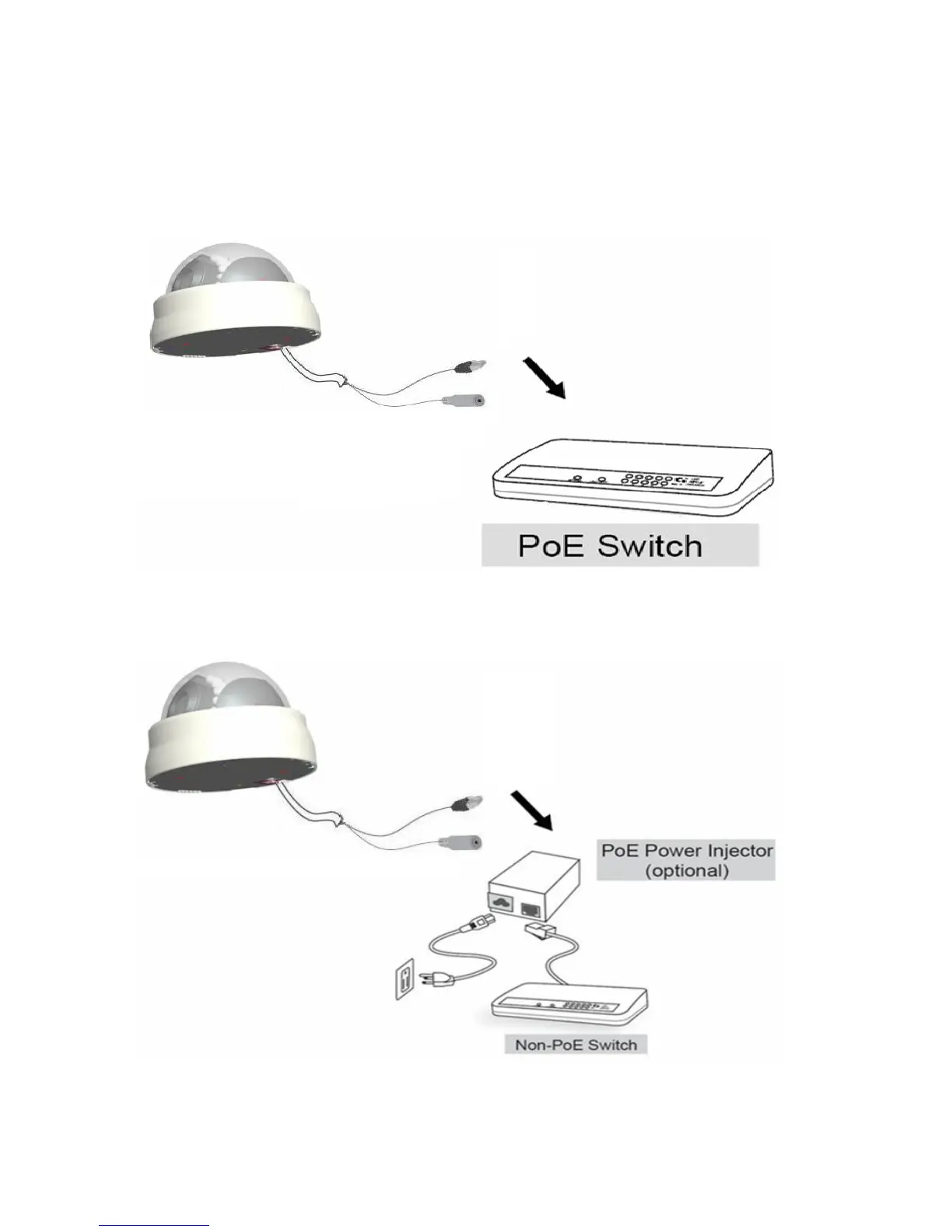 Use a PoE power injector (optional) to connect between the Network Camera and a
