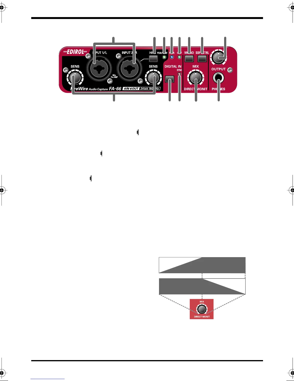Turn this on ( pressed inward) if you want to control the direct monitor mixer (see