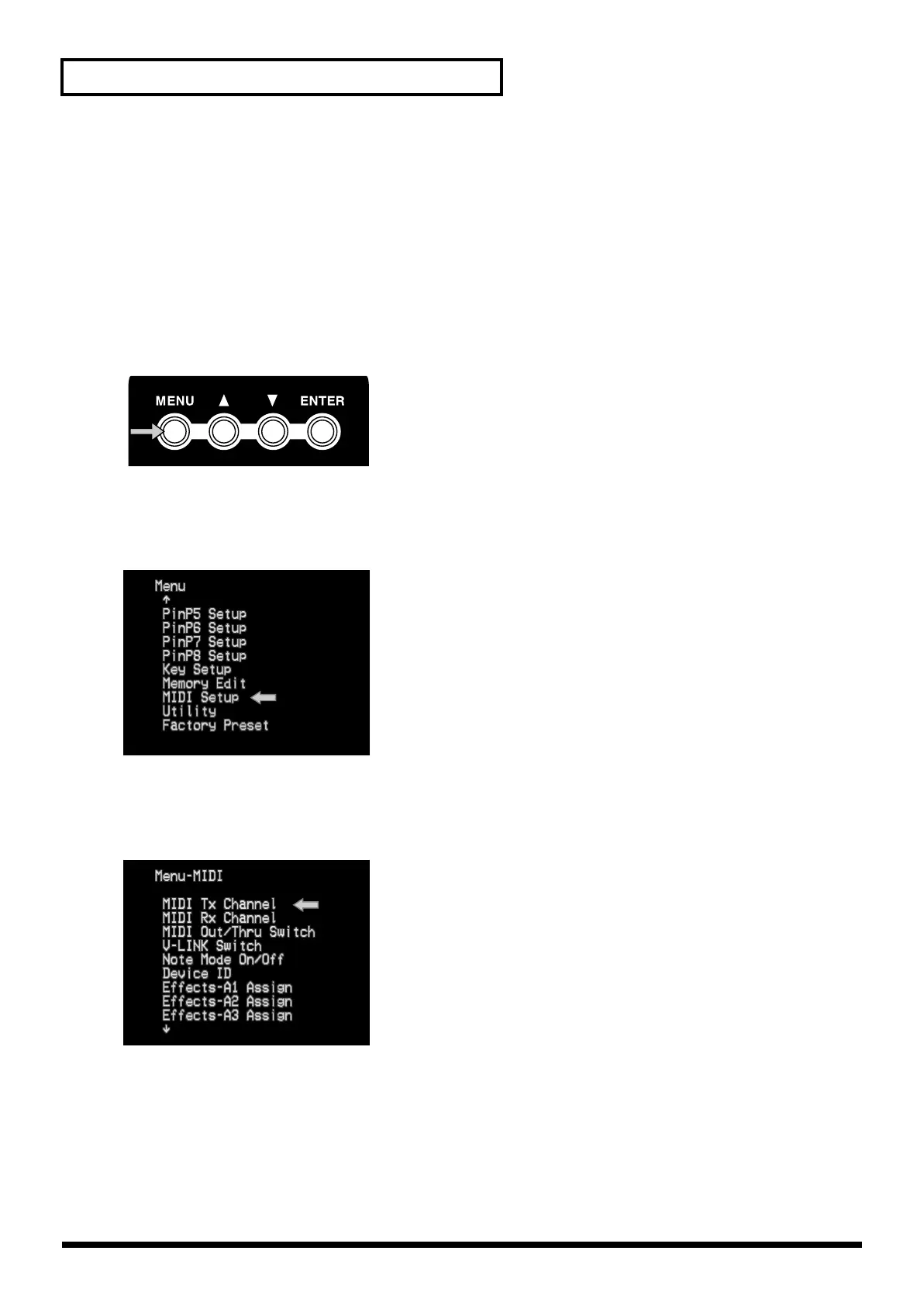 Use the cursor buttons to select “MIDI Tx Channel.” Press the enter button (ENTER) to enter the