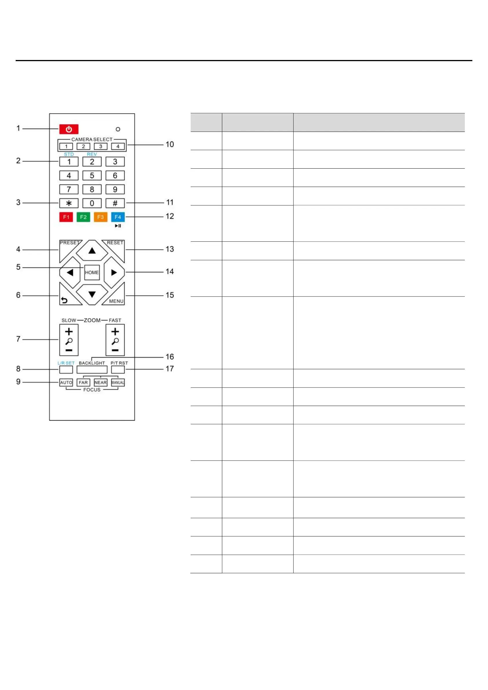 17 PTZ Reset Key PTZ starts to self-test after pressed it