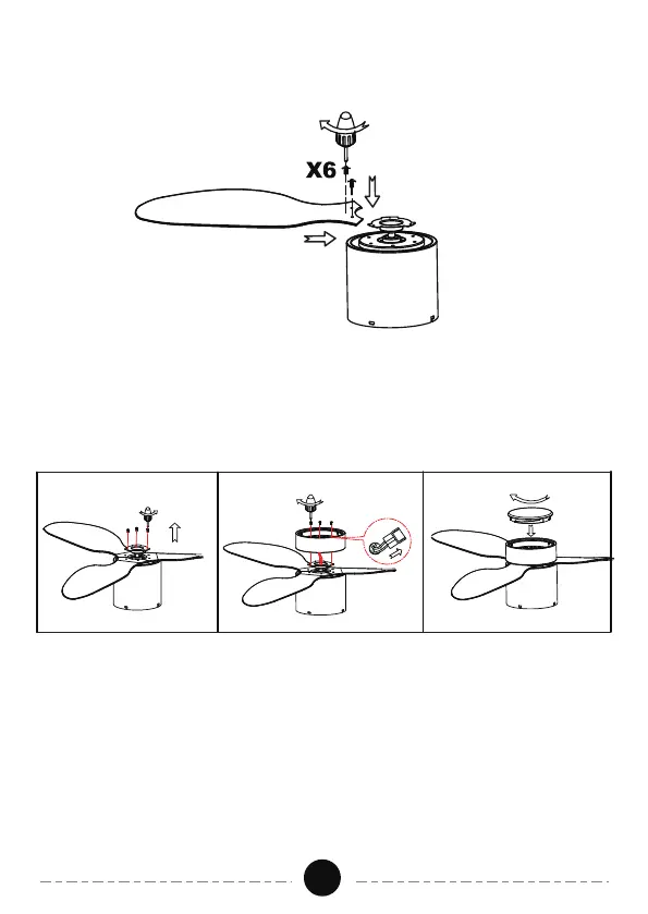 One blade at a �me,Align the blade with the 2 holes in the motor,