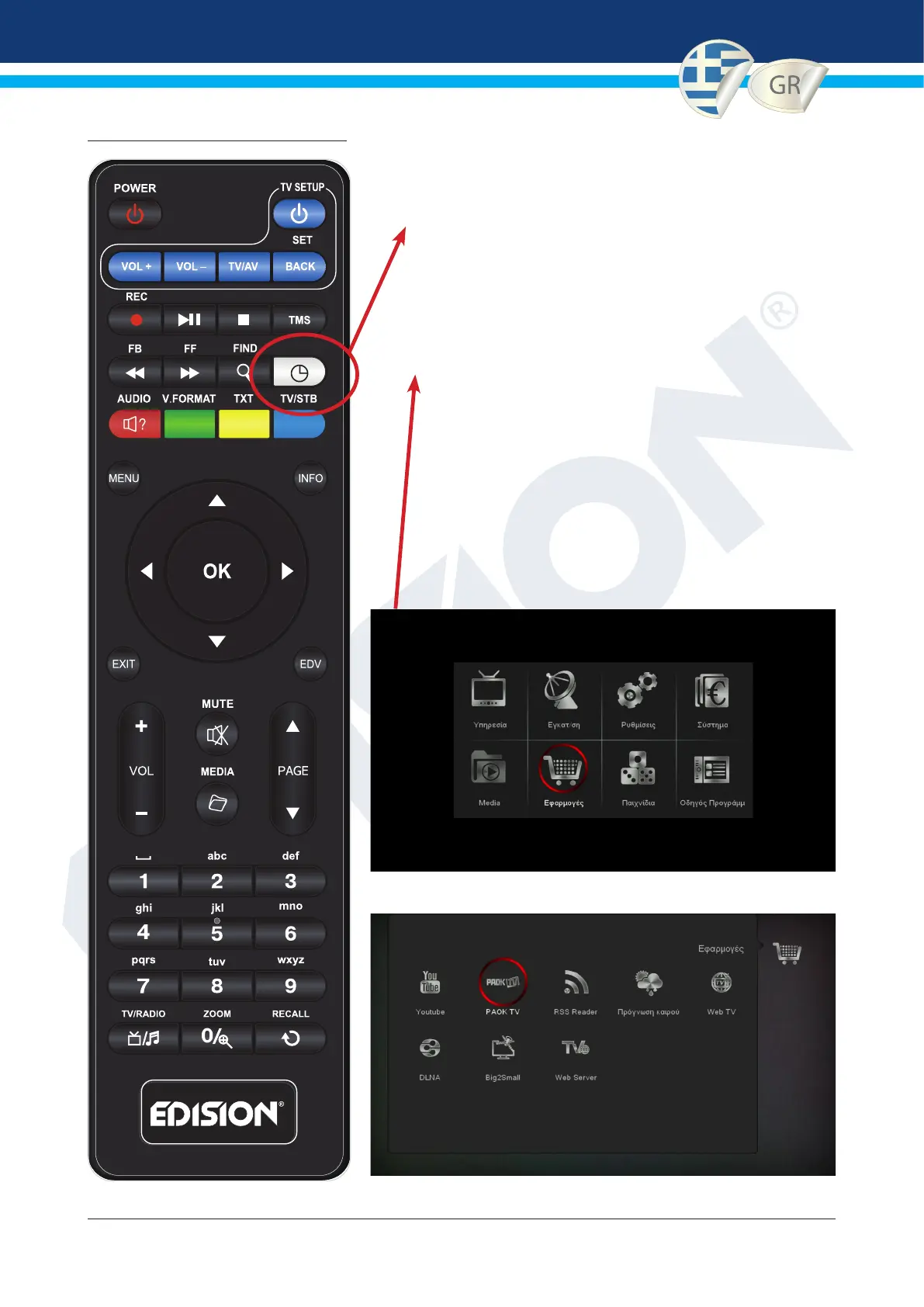 1. Πιέζοντας το άσπρο πλήκτρο TV/STB στο τηλεχει-