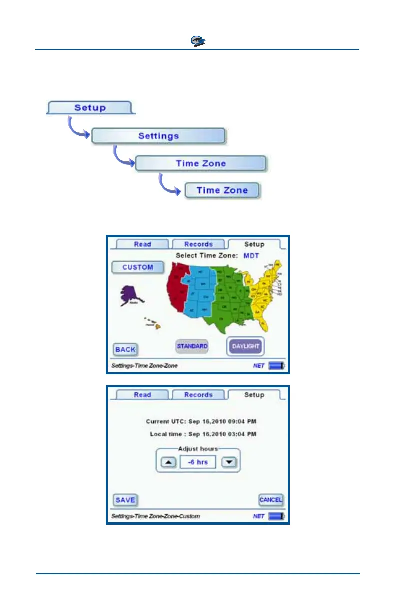 or daylight savings time. Touch the CUSTOM button to set a different time zone.